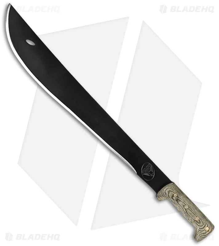 The El Salvador Machete CS from Condor Tool & Knife has a black epoxy powder coated 1075 high carbon steel blade and Micarta handle with a lanyard hole. This knife includes a black leather sheath.