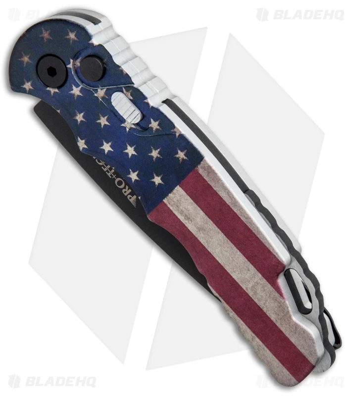 This custom TR-5 automatic has an anodized handle with a Vintage USA Flag graphic and a two-tone black back spacer/lanyard attachment. Its blade is made from black DLC coated CPM-S35VN steel. The knife comes outfitted with a black push value, hardware, and pocket clip.