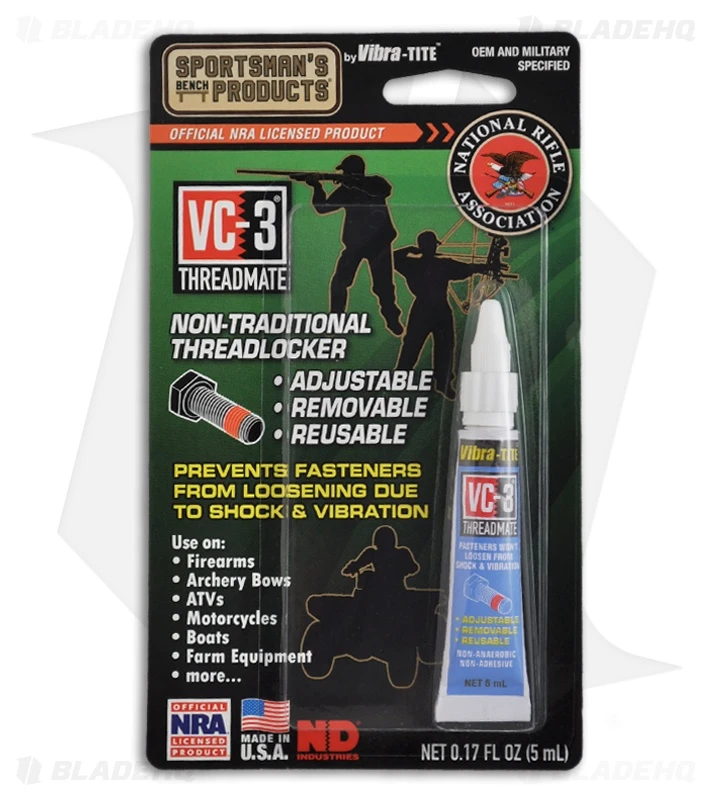 Sportsman’s Bench Products by Vibra-TITE. VC-3 Threadmate is a versatile threadlocker that prevents fastener loosening due to shock and vibration. It is adjustable, removable, and reusable 5 times or more. Includes instructions for use.
