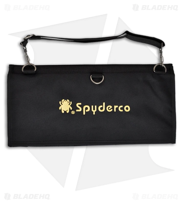 Constructed from heavy-denier polyester Cordura, the pack has eighteen deep pockets sized to hold even larger folders. Each pocket is fronted with a plastic window for viewing knives tucked inside. It tri-folds over and seals closed by way of a Velcro strip running the width of the pack. The knives remain secure and separated in their pockets and cannot rub or scratch against each other. An adjustable length shoulder strap attaches with two durable steel D-rings letting you hang the pack for display on a wall or sling it over your shoulder to take with you. Spyderco’s name and bug logo are embroidered in gold thread on the closing flap. Available in black.